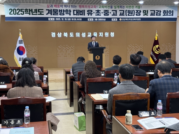 [파이낸셜경제=김지훈 기자] 경상북도의성교육지원청은 12월 19일 의성교육지원청 3층 대회의실에서 '2025학년도 겨울방학 대비 유·초·중·고 교(원)장 및 교감 회의'를 개최하여 겨울방학 중 학생 안전을 확보하고 교육과정 마무리 및 새 학년도 준비 방향을 함께 모색하는 시간을 가졌다. 이번 회의는 ‘삶과 배움이 하나 되는 의성교육! 교육비전을 설계하는 따뜻한 겨울!’이라는 슬로건 아래, 학교 현장의 요구를 반영한 실질적인 협의에 중점을 두고 운영됐다.