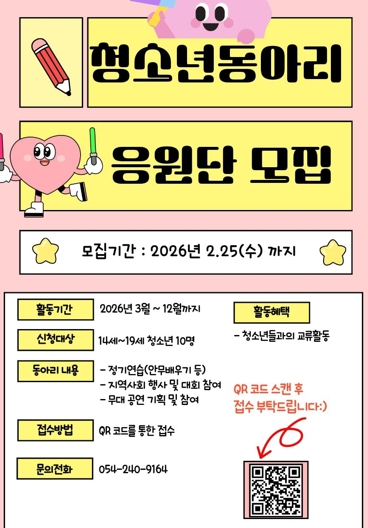 [파이낸셜경제=김지훈 기자] 포항시청소년재단 남구청소년문화의집은 오는 25일까지 14세부터 19세 청소년을 대상으로 청소년동아리 ‘응원단’ 회원을 모집한다.