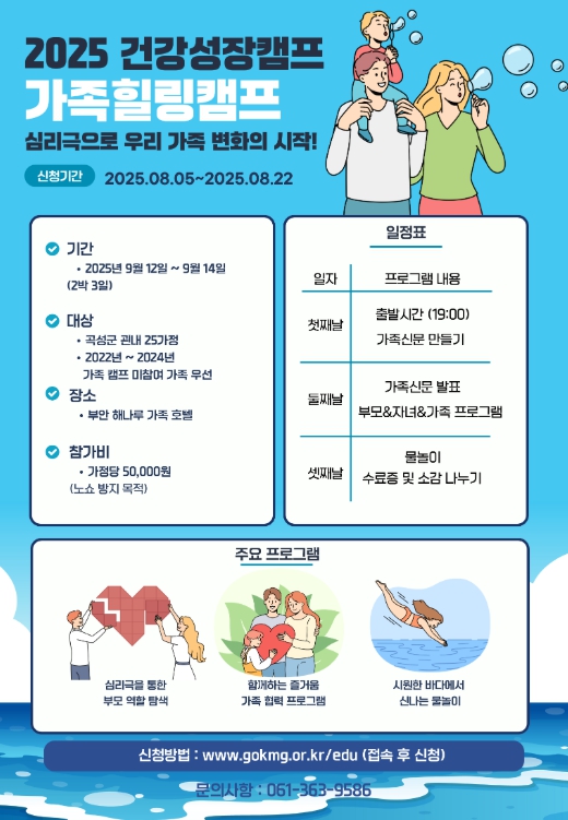 [파이낸셜경제=김예빈 기자] 곡성군미래교육재단은 직접 주최하고 곡성군청소년상담복지센터가 주관하는 '가족힐링캠프'가 9월 12일부터 14일까지 2박 3일간 개최된다고 7일 전했다.