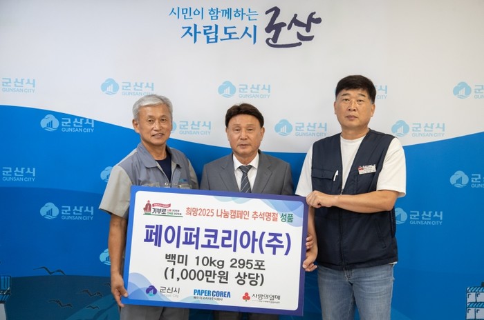 [파이낸셜경제=김예빈 기자] 군산시는 페이퍼코리아㈜(대표이사 권육상)가 다가오는 추석, 어려운 이웃을 위해 백미10㎏ 295포(1천만 원 상당)를 기탁했다고 25일 밝혔다.