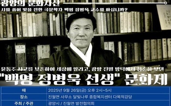 [파이낸셜경제=김예빈 기자] 광양시는 진월면발전협의회가 오는 9월 26일 오후 2시 달빛나루 종합복지센터 다목적강당에서 ‘백영 정병욱 선생 문화제’를 개최한다고 밝혔다.