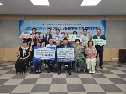 [파이낸셜경제=김예빈 기자] 곡성군은 지난 12일 광주 광산구 도산동 행정복지센터에서 광산구 도산동 통장단과 전라남도 곡성군연합청년회가 '고향사랑기부제 활성화를 위한 상생 협약'을 체결했다고 15일 밝혔다.