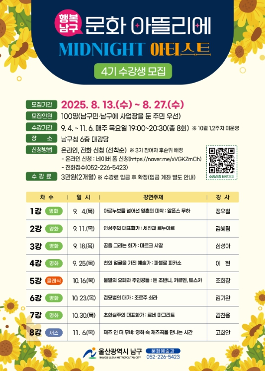[파이낸셜경제=김예빈 기자] 울산 남구는 문화예술 프로그램 ‘행복남구 문화 아뜰리에’ 4기 수강생을 13일부터 27일까지 모집한다고 밝혔다.