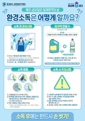 오상순 충북도 감염병관리과장은 “매주 금요일은 도민들이 일상에서 실천할 수 있는 ‘생활 속 방역’을 실천하는 날”이라며 “개인 위생수칙을 준수하고 각 가정과 일터를 중심으로 자발적 소독 활동에 적극 동참해 달라”고 당부했다.
