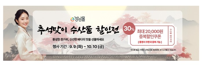 온라인몰 특별 할인 기획전은 9월 10일부터 10월 10일까지 운영된다. 경남도가 운영하는 ‘e경남몰’과 대형 유통 플랫폼 ‘롯데ON몰’에 도내 159개 업체가 총 720개 품목을 선보인다.