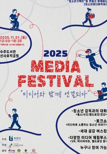 [파이낸셜경제=김기보 기자] 부천시와 고리울청소년센터가 주관하는 ‘2025 미디어 페스티벌’이 오는 11월 1일 오후 1시부터 6시까지 수주도서관과 선사유적공원에서 개최된다. 이번 축제는 청소년기획단이 주체가되어 직접 기획하고 준비하여 진행하며, ‘미디어와 함께 연결되다’를 주제로, 사람-사람, 사람-기술이 미디어를 통해 함께 소통하고 공감하는 장을 마련했다.