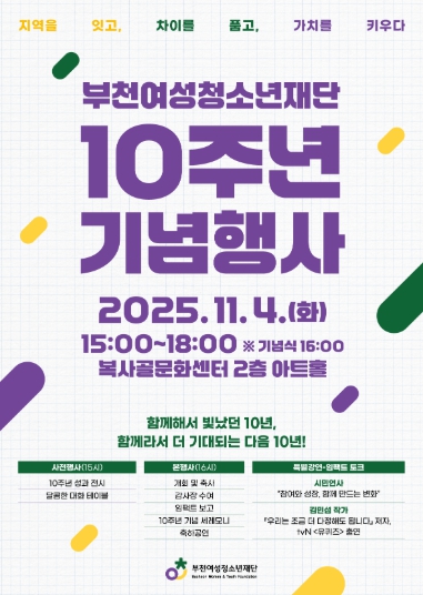 [파이낸셜경제=김기보 기자] 부천여성청소년재단은 11월 4일 오후 3시부터 복사골문화센터 2층 아트홀에서 설립 10주년 기념행사를 개최한다. 이번 행사는 지난 10년간의 발자취를 돌아보고, 시민과 함께 만들어갈 다음 10년을 그려보기 위해 마련됐다.