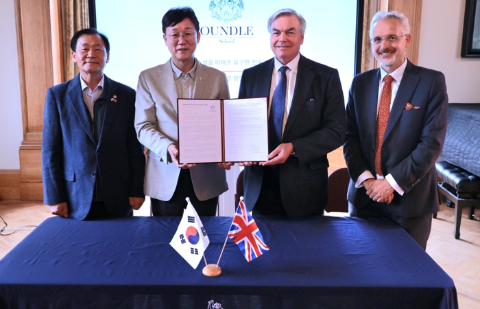 | ▲ 이민근 안산시장(왼쪽 두번째)이 팀 콜리지 온들스쿨 이사회 의장(오른쪽 두번째)과 도미닉 올리버 온들스쿨 교장(오른쪽 첫번째)으로부터 투자의향서를 전달받고 있다. |