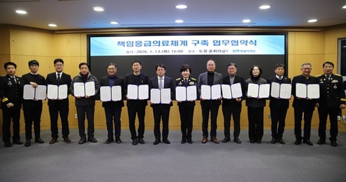 [파이낸셜경제=김예빈 기자] 전북특별자치도소방본부는 응급환자 수용 지연을 최소화하고 중증응급환자가 신속하고 적정한 치료를 받을 수 있도록, 전북특별자치도 복지여성보건국 및 도내 권역·지역응급의료센터 10곳과 '2026년 책임응급의료체계 구축을 위한 업무협약'을 체결했다.