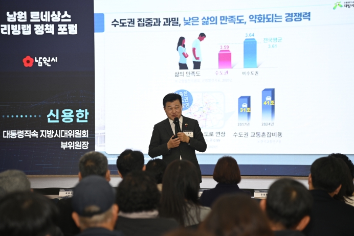 [파이낸셜경제=김예빈 기자] 남원시는 11일 시청 강당에서 ‘남원 르네상스 리빙랩 정책포럼’을 개최하고, 국가 균형발전 전략인 ‘5극 3특’ 정책 기조에 맞춘 남원형 생활인구 확대 전략과 지속 가능한 남원시 활력 제고 방안을 논의했다.