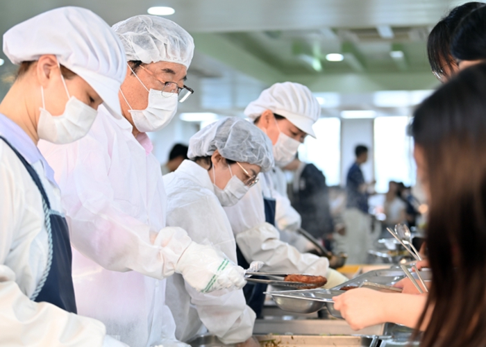 | ▲ 이현재 하남시장(왼쪽 두 번째)이 2025년 7월 21일 고등학교 석식비 지원사업의 첫 시행 현장인 하남고등학교를 찾아 고3 학생들에게 직접 음식을 배식하고 있다. |