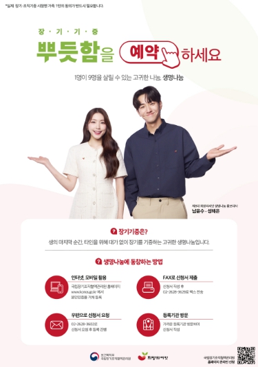 한 사람의 선택으로 장기는 최대 9명, 인체조직은 최대 100명에게 새로운 삶과 희망을 나눌 수 있어, 생명나눔의 의미를 크게 느낄 수 있다.