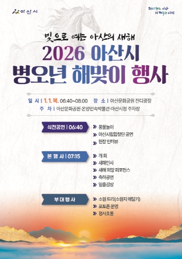 [파이낸셜경제=김영란 기자] 아산시는 2026년 병오년(丙午年) 새해를 맞아 오는 1월 1일 오전 6시 40분부터 8시까지 아산문화공원 잔디광장에서 ‘2026 병오년 해맞이 행사’를 개최한다.