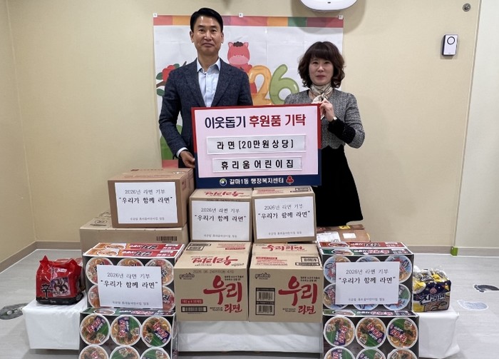 갈마1동 행정복지센터는 14일 휴리움어린이집으로부터 ‘우리가 함께라면’ 나눔 실천 행사를 통해 마련한 라면(20만 원 상당)을 기탁받았다.