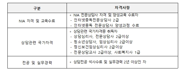 선발 자격은 ▲한국지능정보사회진흥원 시행 인터넷 중독 전문상담사 2급 자격증 소지자 ▲인터넷중독 전문인력 양성교육 이수자 등 관련 자격을 갖춘 인력이다.
