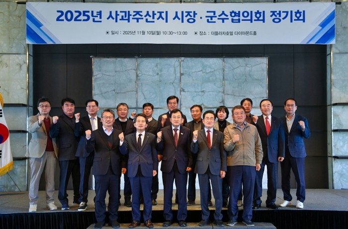 | ▲ 지난 10일 서울 더 프라자호텔에서 열린 경상북도 사과주산지 시장군수협의회 정기회 참석 기관단체장들이 기념촬영을 하고 있다. |