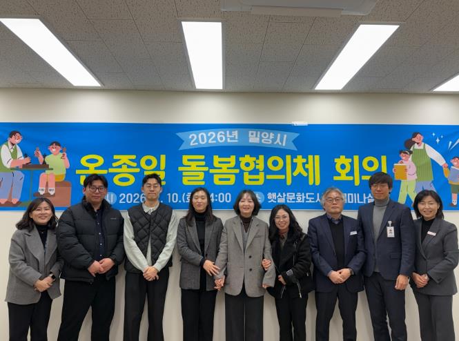 | ▲ 10일 햇살문화캠퍼스 세미나실에서 ‘2026년 밀양시 온종일 돌봄협의체’ 회의를 마친 후 기념촬영을 하고 있다. |