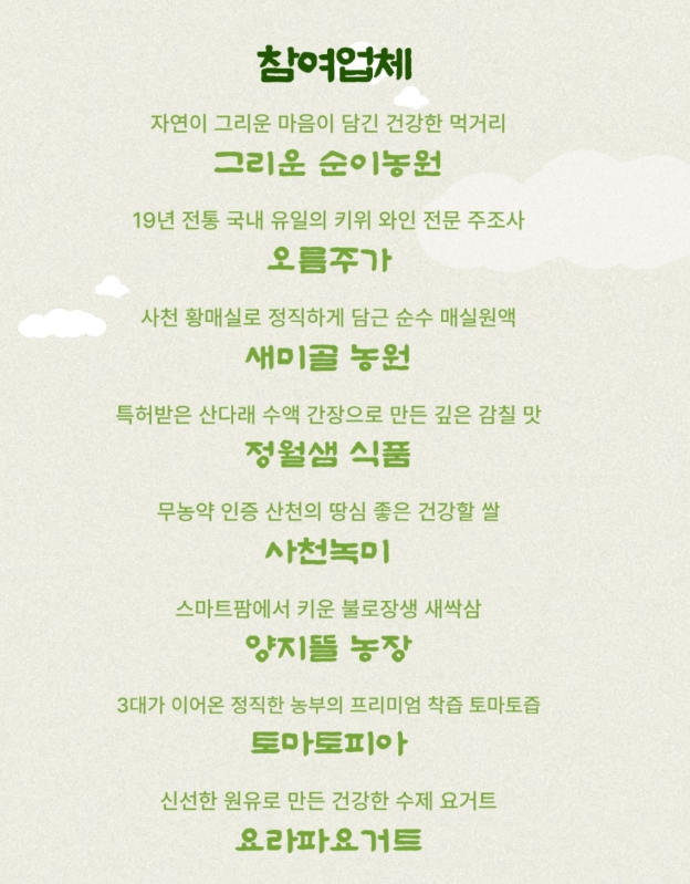 관내 8개 농가가 참여해 대표 농산물(농가별 30개 한정)을 선보인다. 주요품목은 과일, 와인, 매실액, 장류, 햅쌀, 새싹쌈, 토마토즙, 요거트 등으로 다양하다.