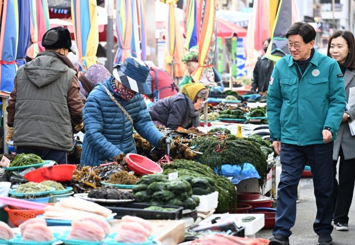 | ▲ 정종복 기장군수가 설을 맞아 기장시장 현장점검을 하고 있다. |