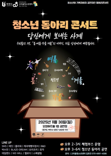 [파이낸셜경제=김기보 기자] 부천여성청소년재단이 운영하는 고리울청소년센터는 2025년 11월 30일, 부천시 고강동 소재 오정아트홀 1층 공연장에서 지역 청소년들이 직접 기획하고 무대에 오르는 특별한 공연, ‘청소년 동아리 콘서트 – 당신에게 보내는 사계’가 열린다.