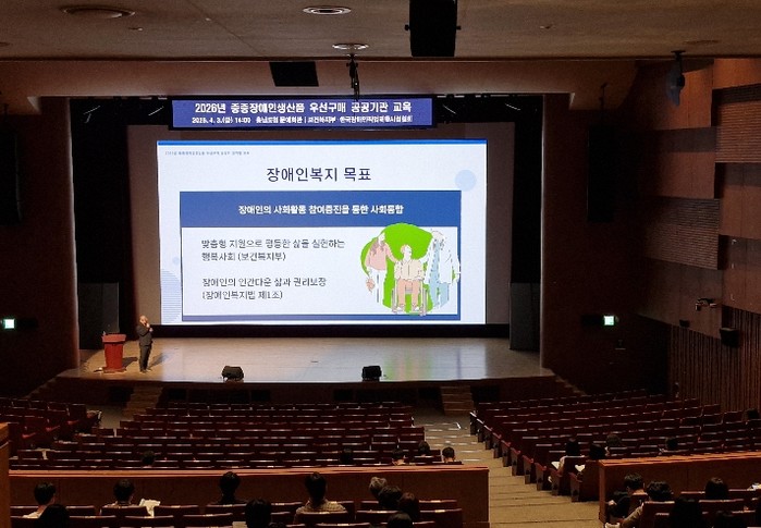 [파이낸셜경제=김영란 기자] 충남도는 3일 도청 문예회관에서 중증장애인 생산품 우선구매 관련 공공기관의 인식 제고 및 구매 독려를 위한 ‘2026년 공공기관 중증장애인생산품 우선구매 교육’을 실시했다.