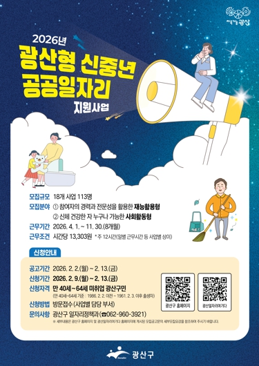 신청 기간은 9일부터 13일까지 각 일자리 담당 부서에 방문하면 되며, 공공일자리 관련한 자세한 사항은 광산구 누리집이나 광산구 일자리 통합플랫폼(광산 일자리 여기다) 누리집에서 확인할 수 있다.