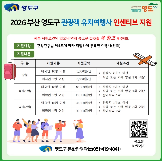 영도구 관계자는 “이번 인센티브 지원 사업을 통해 단체 관광객 유치를 확대하고, 관광 소비가 지역경제로 이어지는 선순환 구조를 강화할 계획”이라며, “전국 여행사의 적극적인 관심과 참여를 기대한다”고 말했다.