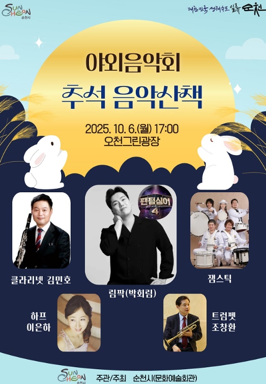 [파이낸셜경제=김예빈 기자] 순천시 문화예술회관은 추석 명절을 맞아 시민과 관광객을 위한 야외음악회 '추석 음악산책'을 10월 6일 추석 당일 오후 5시에 오천그린광장에서 개최한다고 밝혔다.