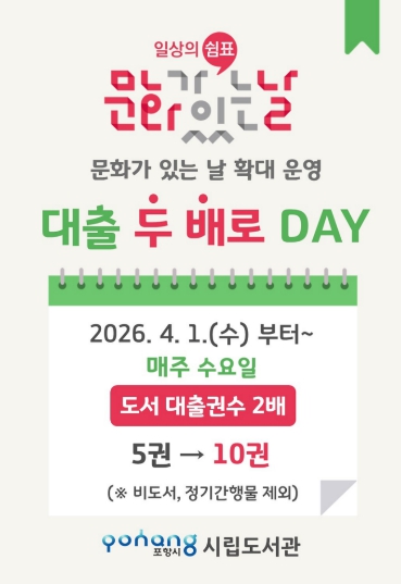 서양진 시립도서관장은 “문화 정책 흐름에 맞춰 시민들이 일상에서 자연스럽게 독서를 즐길 수 있도록 서비스를 확대하고 있다”며 “이번 ‘대출 두배로데이’가 시민들의 독서 생활에 실질적인 도움이 되기를 기대한다”고 말했다.