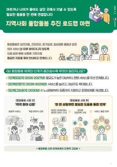 지역사회 통합돌봄제도는 고령화 심화와 복합적 돌봄수요 증가에 대응하여, 기존에 분절적으로 제공되던 의료‧요양 등 돌봄서비스를 통합적으로 연계하기 위해 도입됐다. 그간 시범사업을 통한 준비과정을 거쳐 오는 3.27일 전국적으로 시행될 예정이다.
