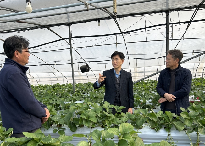 농업기술센터는 농촌진흥청 국립농업과학원 이상재 원장 직무대리를 비롯한 전문가와 함께 지역 내 딸기 시설재배 농가를 방문해 딸기 생육 상황을 점검하고 필요한 기술지원 수요를 파악했다.
