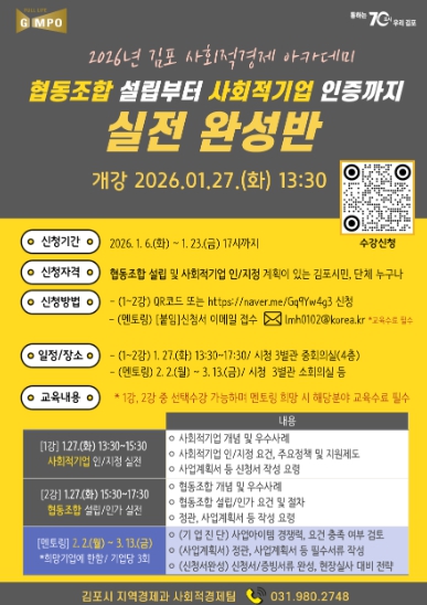 [파이낸셜경제=김기보 기자] 김포시가 사회문제 해결을 위한 참신한 아이디어와 실행력을 갖춘 사회적경제기업 육성을 위해 '2026년 김포시 사회적경제 아카데미'를 개설하고, 오는 1월 23일까지 수강생을 모집한다.