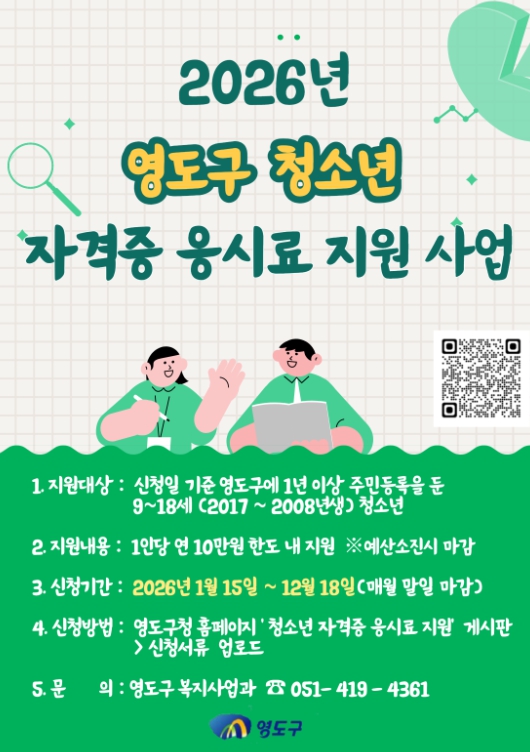 지원 대상은 영도구에 1년 이상 주민등록을 두고 거주하는 9세부터 18세(2008년~2017년생) 청소년으로, 2026년에 시행되는 국가기술자격, 국가공인자격, 민간자격 시험 응시료를 지원한다.