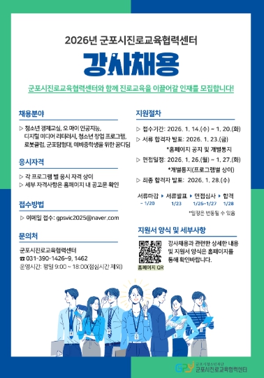 [파이낸셜경제=김기보 기자] (재)군포시청소년재단 군포시진로교육협력센터는 관내 청소년의 진로 탐색과 진로 역량 강화를 위해 '2026년 군포시진로교육협력센터 강사'를 채용한다고 밝혔다.