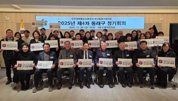 [파이낸셜경제=박영진 기자] 부산 동래구는 지난 12월 26일 오후 6시 동래구청 다목적실에서 민주평화통일자문회의 부산동래구협의회(협의회장 추한권)가 자문위원 39명이 참석한 가운데‘화해·협력의 남북 관계 재정립을 위한 정책 방향’을 주제로 2025년 제4차 정기회의를 개최했다고 밝혔다.