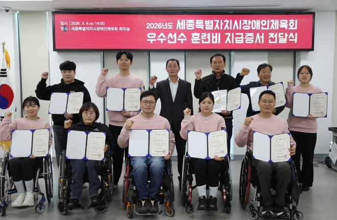 [파이낸셜경제=김영란 기자] 세종시장애인체육회가 4일 세종시장애인체육회 회의실에서 지난해 각종 대회에서 우수한 성적을 거둔 선수들에게 우수선수 훈련비 지급 증서를 전달했다.