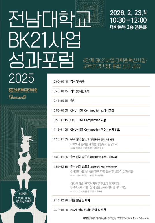 18일 전남대학교에 따르면, 대학원은 지난 한 해 동안의 교육·연구 성과를 정리하고 공유하는 소통의 장으로 오는 2월 23일 오전 10시 대학본부 2층 용봉홀에서 '2025 전남대학교 BK21사업 성과포럼'을 개최한다.