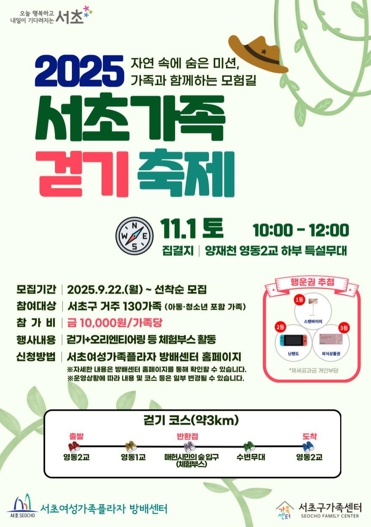 [파이낸셜경제=김예빈 기자] 서울 서초구는 서초여성가족플라자 방배센터, 서초구 가족센터와 함께 11월 1일 서울의 대표적인 생태하천인 양재천에서 ‘2025 서초가족 걷기 축제’를 개최한다고 밝혔다.