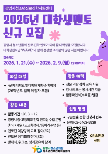 [파이낸셜경제=김기보 기자] 광명시청소년재단 청소년진로진학지원센터는 관내 중·고등학교 청소년 대상 학과 멘토링 운영을 위해 ‘2026년 대학생 멘토단(wave)’을 모집한다고 밝혔다.