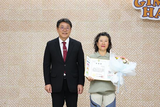 | ▲ 왼쪽부터 홍태용 김해시장, 이달의 우수 자원봉사왕 이미선씨 |
