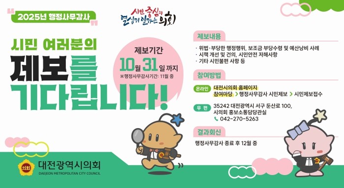 제보는 대전시의회 누리집(참여마당→행정사무감사 시민제보)에 올리거나 방문 및 우편(대전시 둔산로 100, 의회사무처 홍보소통담당관) 등을 통해 누구나 참여할 수 있다.