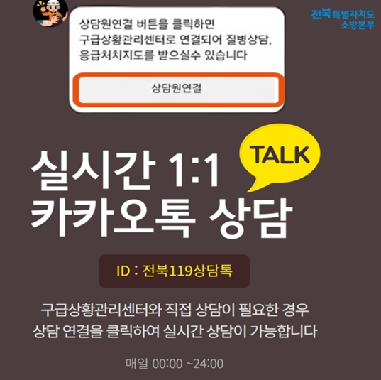 또한 전화 통화가 어려운 상황에서도 의료 상담을 받을 수 있도록 카카오톡 기반 비대면 상담 서비스인 ‘전북119상담톡’을 운영해 병·의원 운영 여부 확인과 의료 상담, 응급처치 안내를 보다 편리하게 제공받을 수 있다.
