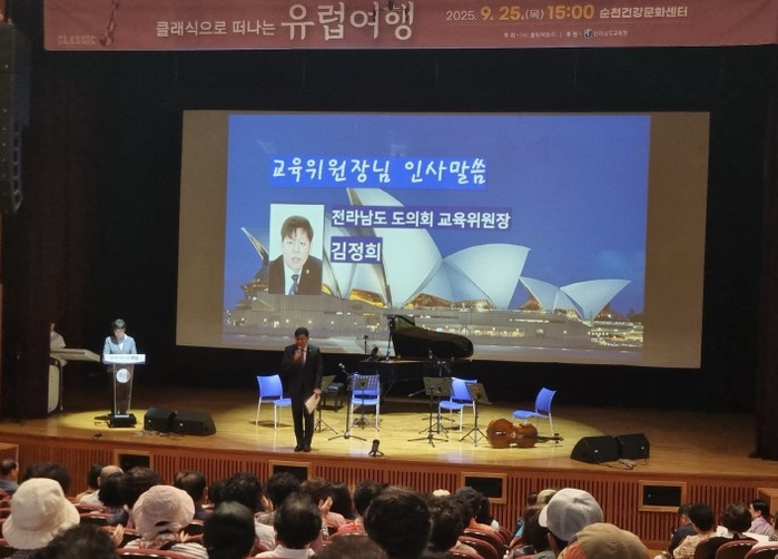[파이낸셜경제=김예빈 기자] 김정희 전라남도의회 교육위원장은 9월 25일, 순천건강문화센터에서 열린 ‘클래식으로 떠나는 유럽 예술 여행’ 행사에서 축사를 통해 청소년과 시민들에게 따뜻한 격려와 희망의 메시지를 전했다.