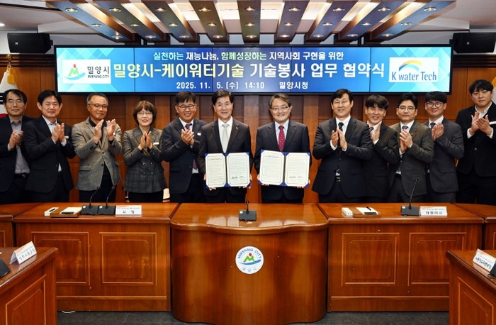 [파이낸셜경제=김예빈 기자] 경남 밀양시와 케이워터기술(주)(대표 정승용)은 5일 시청 소회의실에서 ‘실천하는 재능나눔, 함께 성장하는 지역사회 구현을 위한 기술봉사 업무협약’을 체결했다고 밝혔다.