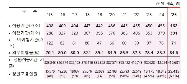 2025년 공공기관 청년고용의무 이행결과에 따르면, 적용기관 462개소의 84.6%(391개소)가 청년고용의무를 이행한 것으로 조사되어 2024년(83.3%, 379개소) 대비 1.3%p(+12개소) 증가했다.