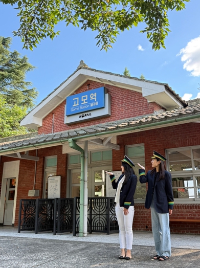 | ▲ 관광객들이 고모역에서 역무원 체험을 하고 있다. |