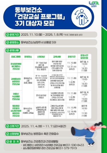 교육은 남양주시 동부보건소 2층에서 진행되며, 11월 4일부터 7일까지 방문 또는 전화로 신청할 수 있다. 이 외에도 △만성질환예방 바디밸런스 △과체중 성인 비만관리 △어르신 낙상 예방 등 다양한 건강증진 프로그램을 함께 모집중이다.