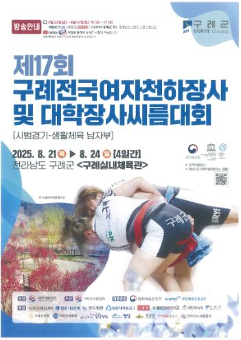 [파이낸셜경제=김예빈 기자] 전남 구례군은 오는 8월 21일부터 24일까지 4일간 구례실내체육관에서 ‘제17회 구례전국여자천하장사 및 대학장사씨름대회’를 개최한다.