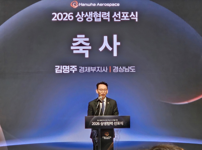 [파이낸셜경제=김예빈 기자] 경상남도는 3일 오후 한화에어로스페이스 창원3사업장 R&D센터에서 열린 ‘한화에어로스페이스 2026 상생협력 선포식’에 참석해 방위산업 분야 대·중소기업 상생협력 확산을 위한 민·관 협력 의지를 재확인했다.