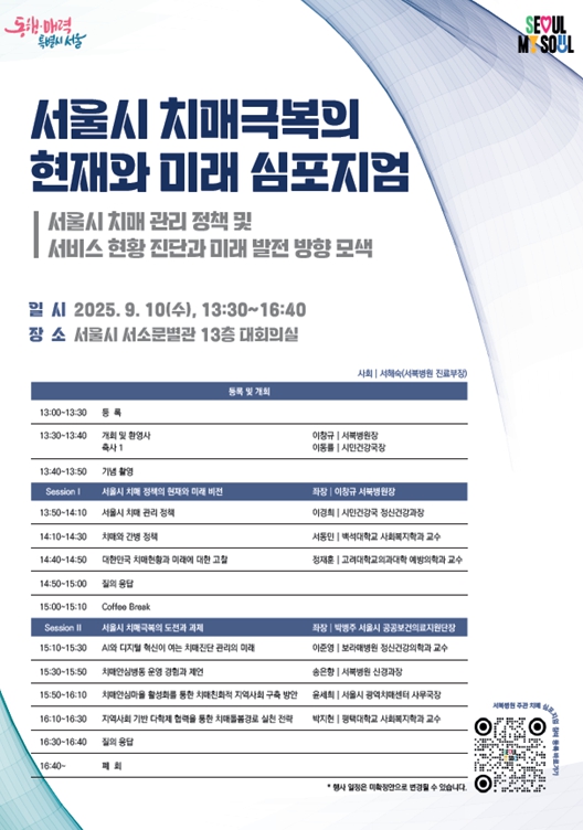 이창규 서울시 서북병원장은 “이번 심포지엄을 통해 참여하신 모든 분들이 서울시 치매 현황과 미래 발전 방향을 위해 생각해보는 계기가 되길 바란다.”며, “앞으로도 서북병원은 공공병원으로서 서울시와 더욱 긴밀히 협력하여 치매 극복을 위해 노력하겠다.”고 말했다.